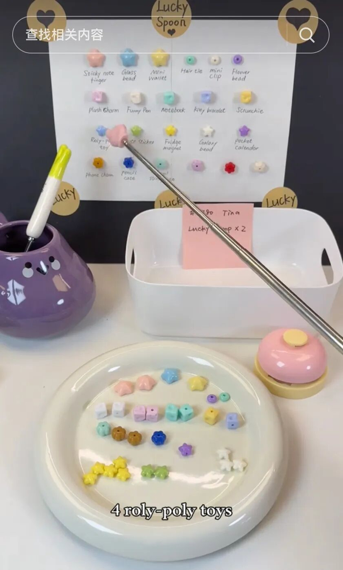 2025年7月,ReRe Gift发布了第一条盲勺视频。视频里,她拿着一把瓷勺,从装满一堆五颜六色塑料珠子的容器里随意一舀,倒在盘中,接着根据珠子的颜色和数量,从货架上逐一找出有着粉嫩可爱外观的毛绒娃娃、卡通便利贴、收纳包……一件件放入打包纸盒。