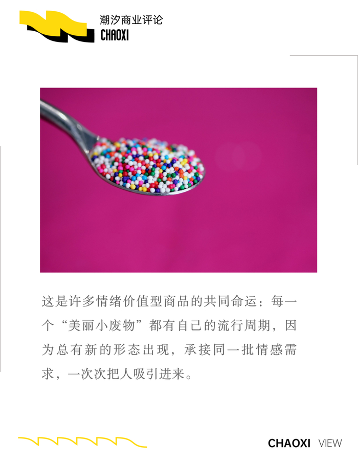 不过,用实用与否来衡量“美丽小废物”的价值,本身意义不大。因为颜值经济与情绪价值的运行逻辑,从一开始就不在实用主义的坐标系里。值得关注的其实是,消费者明知这些东西最终用不太上,却依然买单。这个行为本身,就是市场对其价值的认可。