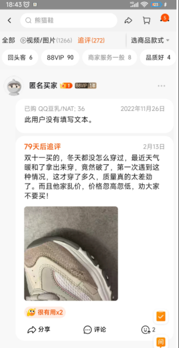 斯凯奇熊猫鞋不到半年开线,消费者追评质量差