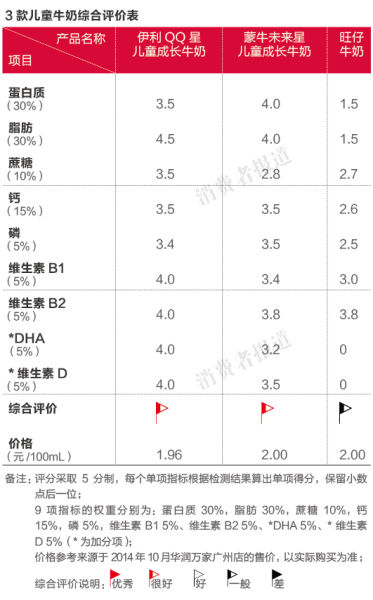 以下为本刊综合这次检测数据做出的3款儿童牛奶的综合评价结果,排名从高至低分别为伊利、蒙牛、旺仔。