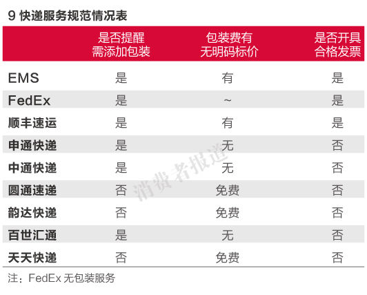 测评中,顺丰速运和EMS两家快递公司的包材和费用由公司统一发放和制定,快递员按照货物重量或体积向顾客收取相应包装费用。但FedEx则不提供该服务。