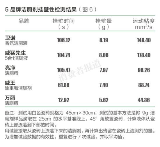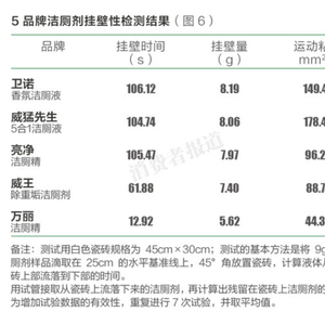 结果显示,卫诺、威猛先生、亮净3品牌洁厕剂的挂壁性比威王、万丽洁厕剂更为优秀,且形成了一定的梯度差距。