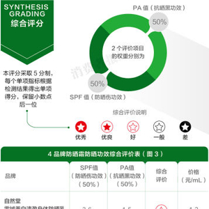 2015年5月,《消费者报道》送检4品牌防晒品,综合防晒伤(SPF值)与抗黑能力(PA值)两项指标,自然堂、妮维雅2款产品均表现较好。而曼秀雷敦与碧柔防晒伤功效与标称不符,从性价比来看,不作推荐。