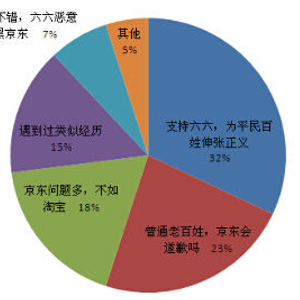 从随机抽样300名网友留言及评论进行倾向性分析可知,三成以上网友支持六六,维权真的很难;两成以上网友则对京东和天天果园对名人的遭遇“鞠躬尽瘁”表示不满;还有近两成的网友表示京东问题很多,真的不如淘宝;更有部分网友述说自己遇到的类似经历;当然也有少数网友认为京东不错,六六是在黑京东。