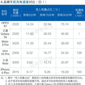 为了验证支持快充的手机是否真的如其宣传所说,同时对比不同快充技术的充电速度,2015年7月,《消费者报道》委托第三方权威机构测试了6款手机,其中4款宣称支持快充,分别是三星Galaxy S6、OPPO R7、Moto X Pro和小米Note;另外2款没有宣称支持快充,分别是iPhone 6 Plus和vivo X5 Pro。为保证测试公平,后两者的充电时间在快充测试中作为空白对比项。