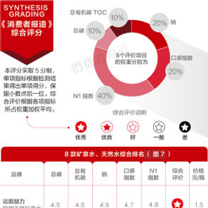 通过综合比较N1指数、总有机碳TOC、总磷、钠、口感指数、菌落总数等指标,矿泉水、天然水中达能益力、景田百岁山性能强悍,而在婴幼儿饮用水中侏罗纪性能低于其它三款,本刊建议消费者慎重选购。达能益力、景田百岁山性能优异