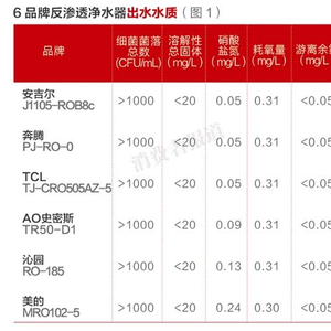 2015年7月,《消费者报道》向第三方权威机构送检AO史密斯、美的、沁园、安吉尔、TCL、奔腾等6品牌反渗透净水器,检测净化后水的溶解性固体、细菌菌落总数、游离余氯等能反映净水效果的指标,以及代表净水速度的净水流量和反映节水性能的回收率指标。