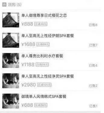 店铺类别分别为“保健/按摩”和“足疗/按摩”。两家软件的团购内容均有688元、888元、1188元、1688元、2980元5种,分别售出22个和25个团购。团购项目的名称有“单人至高无上性经伊朗SPA套餐”、“单人至高无上性经净灵SPA套餐”等包含“性”字样的隐晦词语。