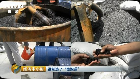 昨天,央视财经《经济半小时》栏目对河北保定沧州等地违规生产塑胶跑道原料的情况,进行了深入的调查,看到触目惊心的一幕:在城乡结合部的一间间私人作坊里,黑心老板们利用废弃的工业橡胶原料,违法制作塑胶跑道的塑胶颗粒,他们明明知道这些废弃橡胶垃圾里含有重金属、含有有毒化学物质,明明知道这些有毒原料会铺设在学校的校园里,但是为了区区的经济利益,全然不顾孩子们的安危,违规违法的进行大肆生产。