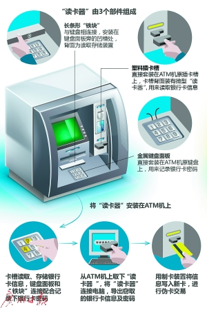 据了解,还有将读卡器套在进卡口,再将监控设备安装在键盘盖内侧,用来摄录用户输入的密码。