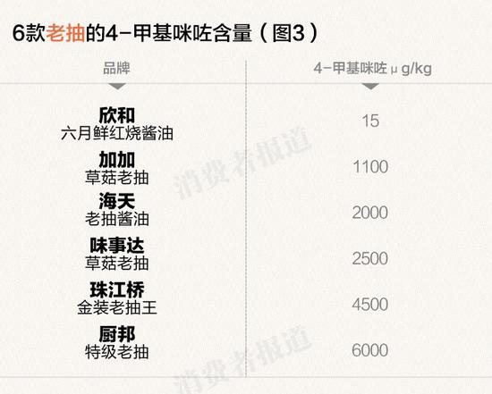 老抽中的4-甲基咪咗明显高于儿童酱油和生抽,其中厨邦特级老抽的4-甲基咪咗含量最高,达到6000μg/kg(6mg/kg),食用5毫升,已超过美国加州规定必须警告的29μg(微克)的参考值。