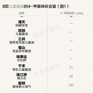 2016年9月,《消费者报道》向权威第三方检测机构送检了21款酱油,包括8款儿童酱油,7款生抽,还有厨邦、海天、珠江桥、味事达、加加、欣和等6款老抽,检测其中4-甲基咪咗的含量。