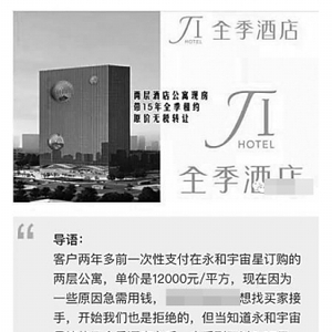 核心提示|“团购|永和宇宙星精装公寓现房原价无税转让,带15年全季酒店租约,12000元/平方米。”“这是当下一个很不错的投资项目:现房直接用、原价转让、无税、13年回本、高铁商务区……”120多户业主看到某微信公众号的团购信息,参加了团购活动。然而一年后,却遭遇“变卦”:全季酒店运营方华宿公司要求业主提供租赁发票,否则将从租金中扣除税金。粗略算账,13年回本的投资变成了20年。