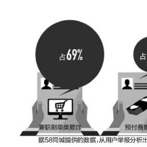 根据58同城网站提供的数据报告,从用户举报来看,招聘欺诈最常见的为兼职刷单类欺诈,占整个招聘业务线举报总数的69%,受害者人均被欺诈金额达到3000元左右,远远高于其他类别互联网欺诈的人被骗金额;其次分别为预付费欺诈(19%)和“黑中介”欺诈(12%)。据报告显示,举报的数据覆盖31个省市区,占全国34个省级行政区的91.2%;涉及235个县级以上城市,占全国661个城市的35%;排名前10的城市分别为:上海、北京、广州、苏州、深圳、天津、成都、重庆、郑州、济南,这10个城市的举报数量占总体数量32.3%。从受教育水平来看,受害者大专及以下学历占比为九成以上,基本符合蓝领求职用户的人群特征。