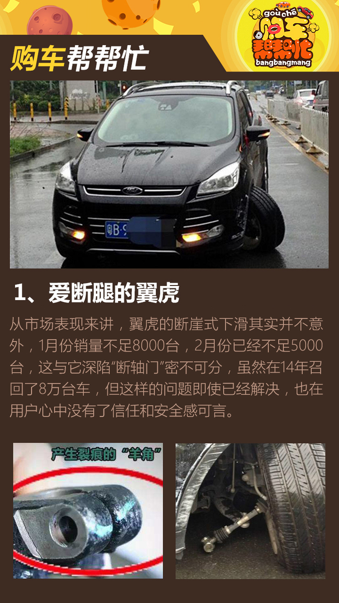 从2014年开始,长安福特陆续召回了8万台翼虎车型,为这些车更换了容易发生断裂的转向总成,也承诺更换零部件供应商。虽然问题正在逐渐得到解决,到现在断轴也不再是集中爆发了,可这样“断”无止境的翼虎,早已经深入用户的内心,选择它或许真的三思!
