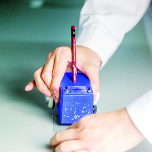 不过,实验室的工程师依然用铅笔硬度器来检测7款均标称具有9H功能的手机膜是否具有相应的耐划伤能力。这个特殊的测量仪器分两个部分,一部分是一辆重量为500g的铁质小车,小车载着铅笔,在手机膜上划过,看是否有划痕。7张手机膜很快都通过了检测,实验员目测发现,除了5号纳米膜有轻微划痕之外,其他手机膜基本都是无痕迹通过了第一轮测试。