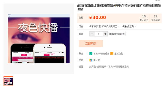 一套价值30元的名为“蜜桃影院”的APP诱导支付源码产品包含29个色情视频和一份源码,还有一份声称能“日赚3000元”的讲解视频。色情视频中,最长视频为5分钟28秒,最短的仅有35秒。
