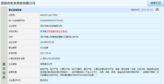 查阅“深圳市信用网”得知,库米科技成立于2016年5月17日,认缴注册资本总额100万元,法定代表人为陈浩南。陈还拥有一家独资企业:深圳市新维航科技有限公司。