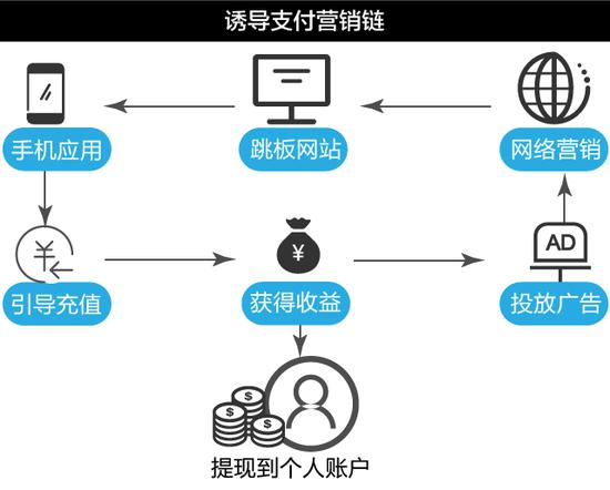 目前,诱导支付行业已经形成了一个完整的产业链,运行逻辑十分清晰。一个涉黄诱导支付平台需要大量投放广告,通过一个跳板网站出现在用户手机上,再进行诱导支付。