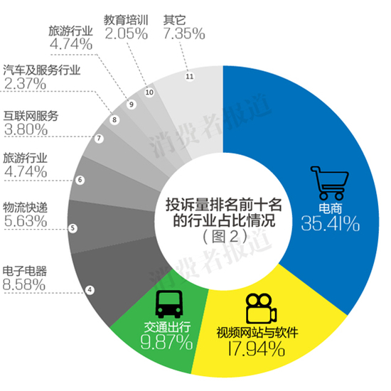 统计结果显示,投诉量排在前五名的行业分别为:电商行业、视频网站与软件、交通出行行业、旅游行业以及电子电器行业,前五名行业的投诉量高达总投诉量的77%。(如图1,2)