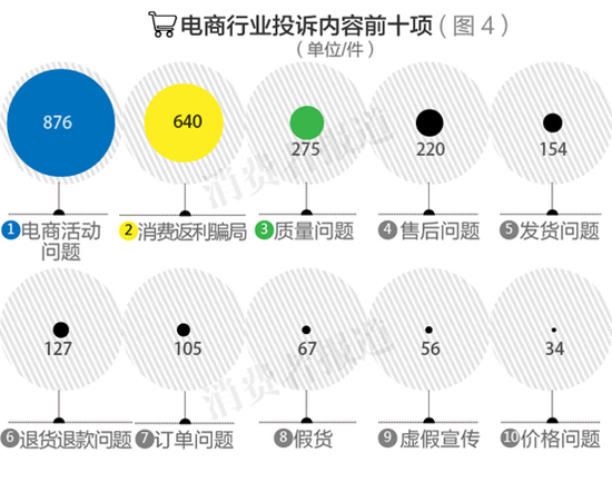 《消费者报道》根据投诉内容性质划分,发现电商活动、消费返利、质量问题、售后问题和发货退货成为电商行业投诉的主要问题。(如图4)
