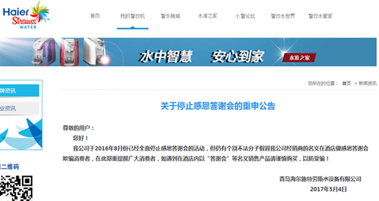 无独有偶,消费者反映,海尔1月2日在佛山顺德大良福盈酒店举办答谢老顾客活动时,以抽奖为由,推销海尔旗下的统帅净水器。对此海尔多次发布公告称,已于2016年8月全面停止感恩答谢活动。