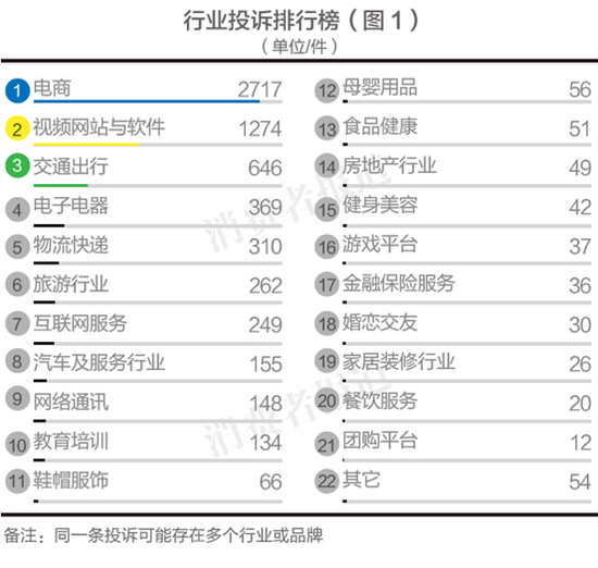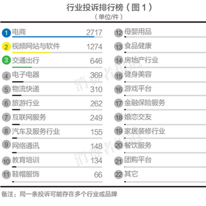 第一季投诉量前五名的行业分别为:电商行业、视频网站与软件、交通出行行业、旅游行业以及电子电器行业,前五名行业的投诉量高达总投诉量的77%