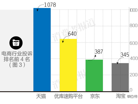 电商行业的投诉不容忽视,第一季度投诉量为2717次,占比35.41%。天猫、优库速购、京东、淘宝居投诉排名前四,这与其用户量和市场份额有密切关系。(如图3)