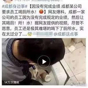 爆料者称,成都一家公司的员工因为没有完成规定的业绩,被惩罚喝厕所水。视频中,一名年轻男子和女子站在厕所隔间,隔间角落的纸篓里堆满了纸张,按下厕所便池的冲水键后,两人分别用纸杯舀了水……男子犹豫再三后皱眉喝下,女子将杯子放到嘴边后又拿开,接着端回来闭眼喝完。