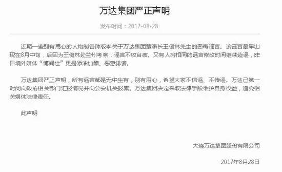 8月27日,有公众号撰文散播了“王健林被边控”之谣言,其称王健林及家人于8月25日在某地准备乘私人飞机出境前往英国时被拦截并扣留,谈话数小时之后准许其离开,但被告知禁止出境。随后,万达集团对消息予以否认,并发表声明称:别有用心的人炮制王健林恶毒谣言,并准备起诉造谣公众号。