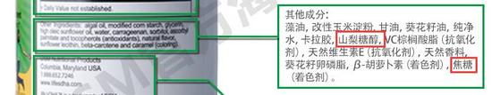 在它的产品配料表中,甜味剂山梨糖醇和着色剂焦糖赫然在列,而这两种物质也是国标不允许添加在婴幼儿食品中的。