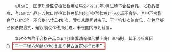 如果是做为进口产品,这是要被销毁的,2016年3月,就曾有一款进口海藻油保健品就因为DHA含量不达国标被上海海关口岸销毁了!