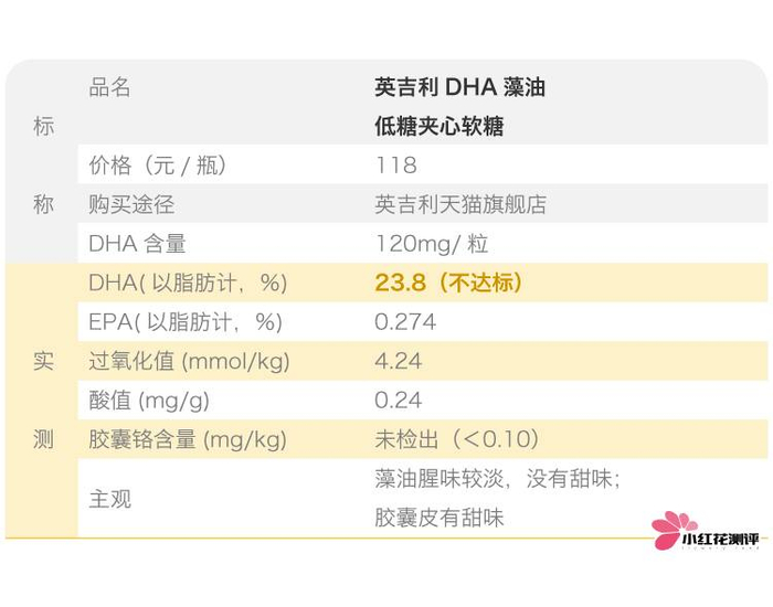 但是从检测结果来看,它的DHA含量只有27.8%,不符合国家标准和行业标准要求的≧35%,在第一关就被PASS了!