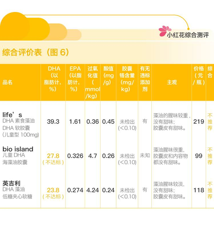 综上来看,这三款热门的婴幼儿藻油产品虽然在油脂新鲜程度、重金属污染等安全指标方面都没有太大问题,但从最重要的DHA含量和成分表来分析,竟无一能通过测评,成为推荐产品。