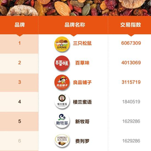 从2016年双11零食销售排名榜单上看,坚果炒货、预包装肉制品、巧克力等三类最受消费者欢迎。更引人注意的其次则是三只松鼠、百草味、良品铺子等坚果类三驾马车,其交易指数一骑绝尘,均突破300万占据了零食交易的半数以上。(如图1)