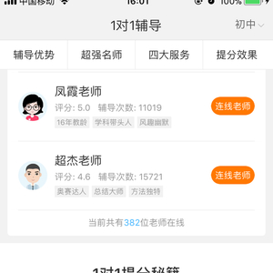 在作业帮APP关于“1对1辅导”的介绍中称,学员人均提分26分,80万学霸在用1对1,8500位专属名师任选,家长满意度92%。在关于1对1辅导的师资介绍中更是表示,98%来自名牌公立高校,教学实力和经验兼备,更懂课堂;60%任中高考出题阅卷人,熟悉考点和命题趋势,应试技巧丰富;授课老师平均教龄15年,教学专业风格有趣,深受学生喜欢和好评。