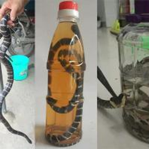 泡制开始,只见一个上身穿迷彩服、下穿黑裤的男子,从编织袋中抓出一条灰、白相间的活蛇,随即用棍子在蛇的脑袋上敲打了两下,原本不停扭动的蛇就不动了。对方解释,蛇被打晕了。抓蛇男子在塑料盆里,将蛇洗了洗,接着将蛇装进一个透明塑料桶中,对方介绍,刚刚装进去的是银环蛇,接着用同样的方法,将另外两条蛇——一条五步蛇、一条眼睛(镜)蛇装进塑料桶中。记者看到,当酒倒入塑料桶后,3条被打晕的蛇开始不停的上下翻滚、挣扎泡制过程用时9分钟。