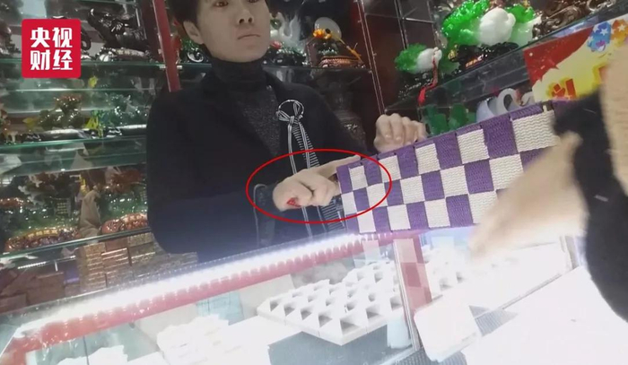 我们把刚才的镜头做回放,这位销售人员的右手从柜台下方拿出了另一张奖券,攥在手心,和盒子中的奖券混在一起,扔在了柜台上。