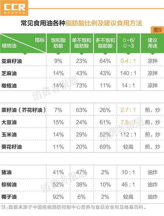 测试结果发现市售9品牌几乎不含Ω-3系列脂肪酸,这让花生油的营养价值大打折扣。不过,消费者可以采取添加其它油脂来补充这个短板,如Ω-3脂肪酸含量较为丰富的亚麻籽油和菜籽油。(如图9)