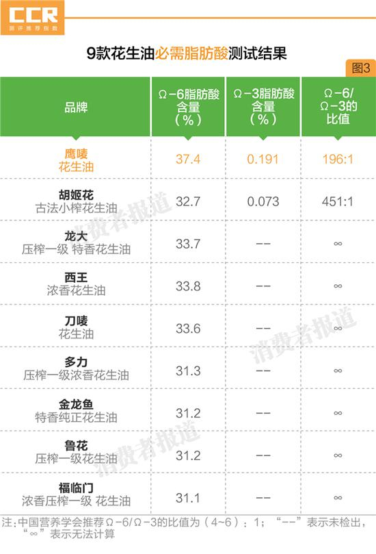 测试结果显示,9款花生油的Ω-6脂肪酸都在30%以上;仅鹰唛和胡姬花含有微量的Ω-3脂肪酸(0.19%和0.07%),其余7款花生油均未检出Ω-3脂肪酸。
