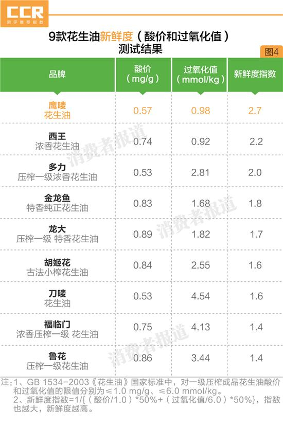 2017年11月,《消费者报道》向权威第三检测机构送检了鲁花、福临门、金龙鱼、胡姬花、多力、鹰唛、刀唛、西王、龙大等9款价格相差较大的压榨型花生油,测试其酸价、过氧化值等鲜度指标和烟点等耐热程度。