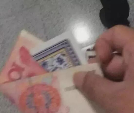 1. 给兼职人群一人发放一张夹着扑克牌的百元钞票;