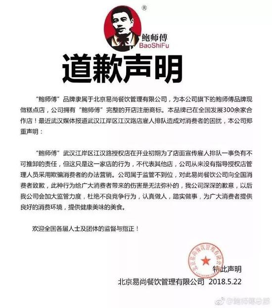 5月22日中午,微博名为“鲍师傅总部”、认证为“北京易尚餐饮管理有限公司”,针对雇人排队事件发布了道歉声明。表示对上述店面开业初期为了店面宣传雇人排队一事负有不可推卸的责任,但同时表示:“只是这一家店的行为,不代表其他店。”