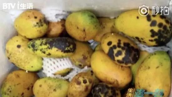 店里摆放了很多新鲜的水果,其中芒果看起来十分诱人,但它们只是摆设而已。真正用来榨汁的是下面这些发黑的芒果!