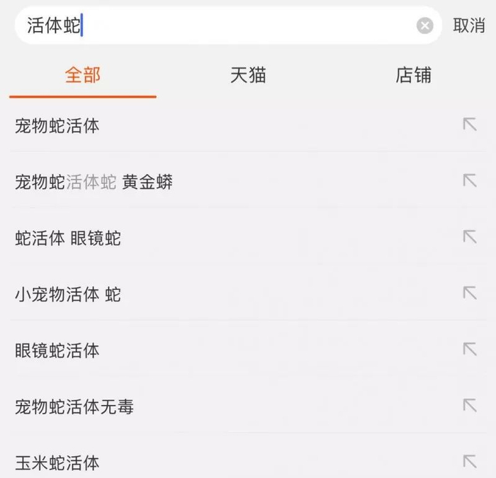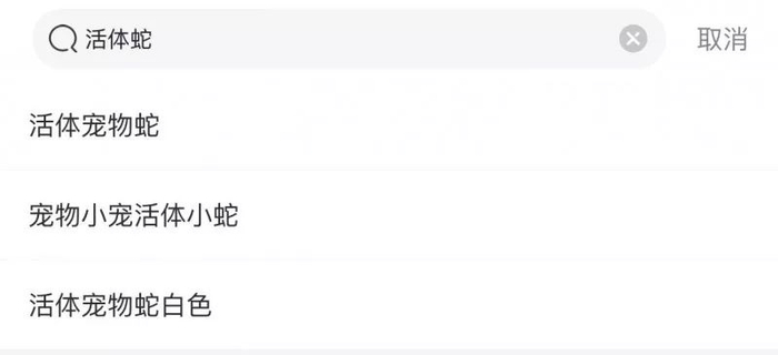 在爱淘宝网搜索栏输入“活体蛇”,平台默认的众多链接中,仍然显示“活体蛇银环蛇 大王蛇”“活体蛇眼镜蛇 大型”“活体蛇 眼镜蛇 小型”“活体蛇银”“活体蛇银环蛇宠物”等热词,其他如“猫活体”“仓鼠活体”“兔子活体”“鸟活体”“乌龟活体”等等链接,非常显眼。