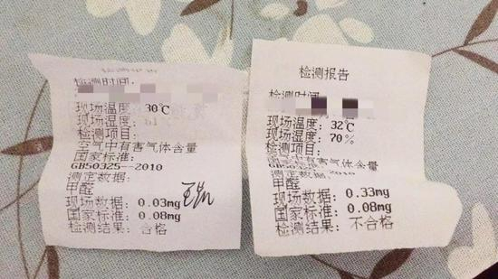 第一次检测结果是0.33mg/L,严重超标。时隔一星期后进行第二次检查,检测方提供的结果显示室内甲醛浓度骤降到0.03mg/L,低于GB50325定下的0.08mg/L的国家标准。但试管内液体颜色仅从第一次的深蓝色,变为第二次的浅蓝色。