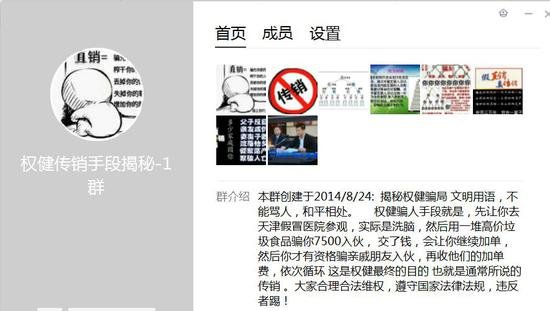 这是最早的一个反权健群,创建于2014年8月24日,群介绍里赫然写着:权健骗人手段就是,先让你去天津假冒医院参观,实际是洗脑,然后用一堆高价垃圾食品骗你7500入伙,交了钱,会让你继续加单,然后你才有资格骗亲戚朋友入伙,再收他们的加单费,依次循环,这是权健最终的目的,也就是通常所说的传销。