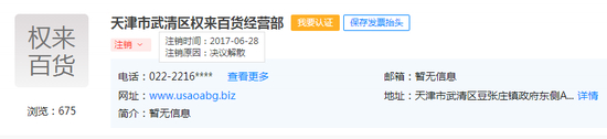 权来的运营方为“天津市武清区权来百货经营部”,法人代表陈亦隆。天眼查显示,该公司已于2017年6月28日注销,注销原因是“决议解散”。