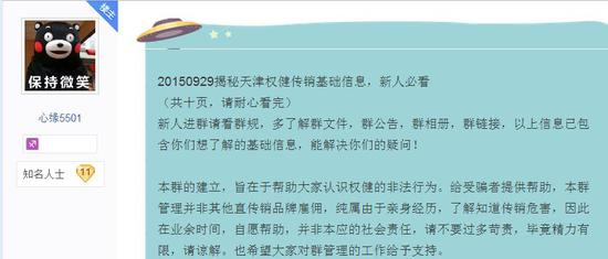 “反权健吧”里,有14583条帖子,关注的人有1649个。三篇置顶帖的楼主“心缘5501”解释了发帖原因,“并非其他直传销品牌雇佣,纯属由于亲身经历,了解知道传销危害,因此在业余时间,自愿帮助”,并附上了四个QQ群号,“我们协助提供各类揭秘方法、举报方法、退款方法、各地公安机关打击火疗店、违规直销、传销实案和事实依据,全程公益不收费”。