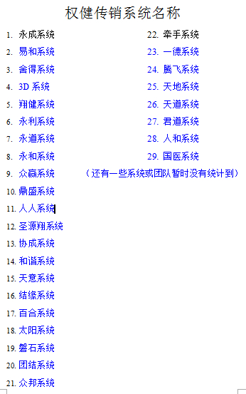 在揭秘群里,有一份《权健传销系统团队名称》,其中统计了29个系统名称,前述的人人系统,排在第11位。